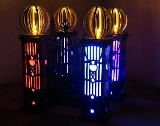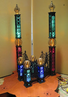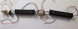 Bei den äußeren Doppeltürmen musste ich mir eine andere Strategie einfallen lassen, denn es wären zu viele Kabel gewesen, welche ich von oben bis unten hätte durchziehen müssen. Es sind in jedem Turm 2 LEDs eingebaut, und jede LED hat ihren eigenen Widerstand. In der Lampe oben hat wieder eine Flacker-LED Platz gefunden. Die Minus-Pole habe ich zusammengeführt, so dass in der Mitte an der Kugel nur 3 Kabel ankommen, denn ich wollte ein 8fach Lauflicht einbauen, damit die Türme nacheinander angesteuert werden können, deshalb die Trennung von Turm, Kerze und Kugel. In die Kugel habe ich eine goldfarbige LED eingebaut, da diese auch so lackiert ist. Ganz unten kommen dann nur 4 Kabel an. 3 Kabel für die Plus-Werte und 1 Kabel für Minus. Was man meines erachten unbedingt machen sollte, wenn man die Zaunposten beleuchten will und wie in dem Fall wie bei mir 2 unterschiedliche LEDs hintereinander legt: diese mit schwarzer Folie abdecken damit das Licht sich nicht vermischt.