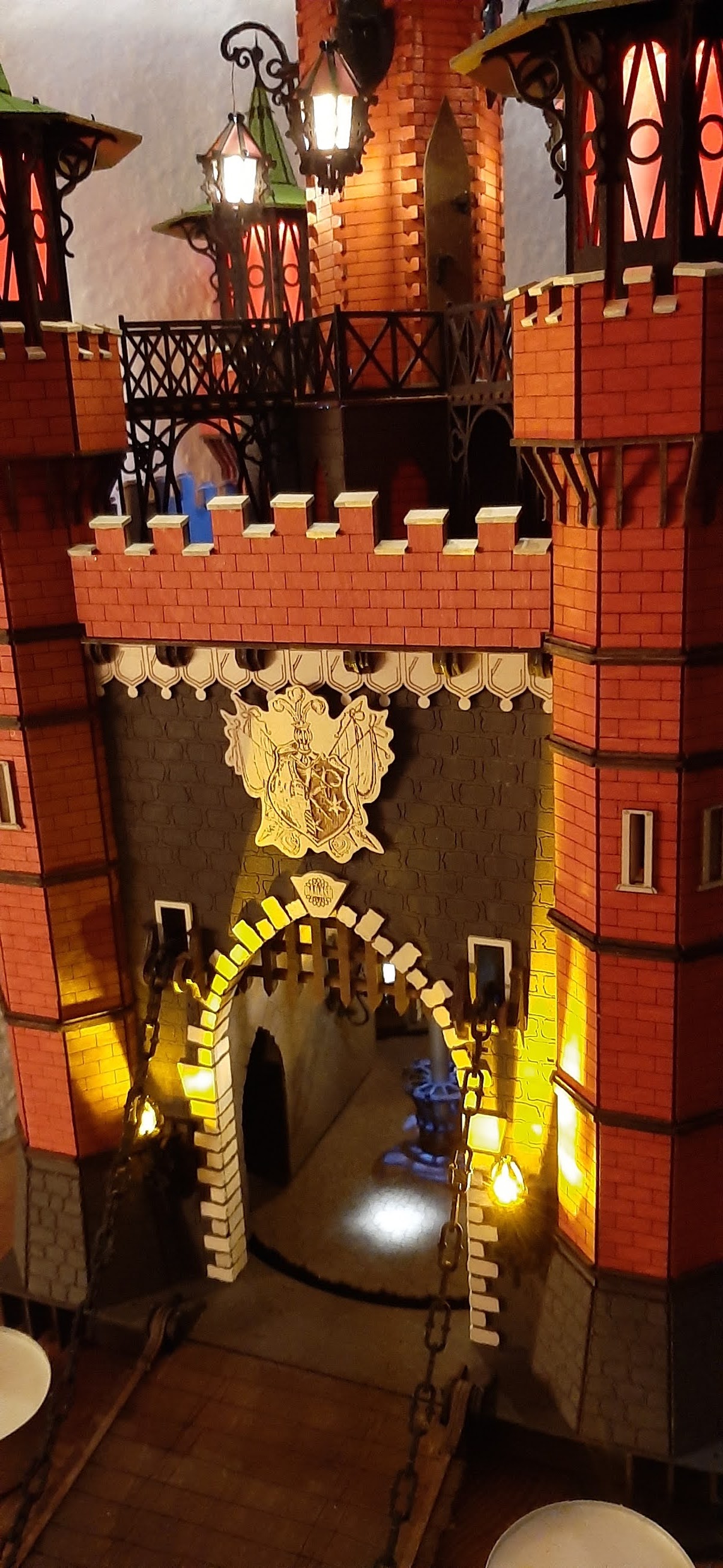 Ich kann jetzt alle Lichtgruppen unabhängig voneinander zu oder wegschalten und die Zinnenaufsätze in rot oder weiß erstrahlen lassen.