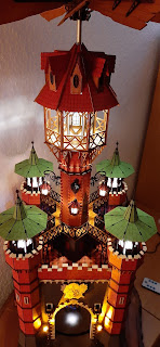 mit etwas Verspätung aber noch rechtzeitig zum Fest ist unsere Stadttor-Pyramide fertig geworden. Wie immer bei Ihren Bausätzen verlief die Montage – auch dank der hervorragenden Anleitung- problemlos, wenn auch ein paar knifflige Situationen dabei auftraten, z.B. die Laternen und der Zusammenbau des Flügelrades. Aber nach ein bißchen Fluchen und tiefem Luftholen wurden auch diese Hürden gemeistert. Der größte Teil wurde original gebaut, ein paar farbliche Akzente an den Natursteinmauern und dem Terrassenboden flossen dabei mit ein. Eine zusätzliche Laterne für den Treppenaufgang kam hinzu.